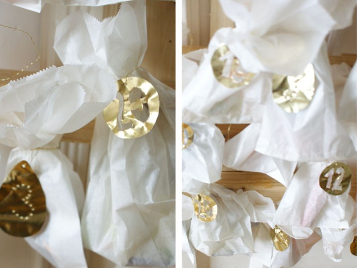 Das Gerüst des Adventskalender habe ich aus alten Holzresten gesägt & zusammengehämmert, die kleinen Geschenke in Butterbrotpapier gepackt, und mit einem goldenen Draht um das Holzgerüst gewickelt. Dünnes goldenes Blech lag auch noch in der Bastelkiste, daraus habe ich dann die Zahlenanhänger mit einer Nagelschere geprickelt und geschnitten …
