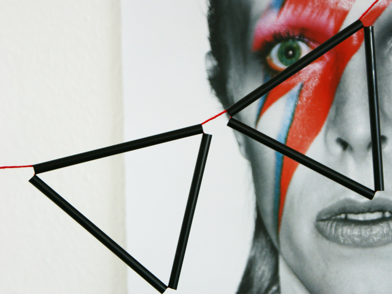 Dann zu einem Dreieck zusammenlegen und durch den ersten Strohhalm noch einmal (zurück)fädeln.