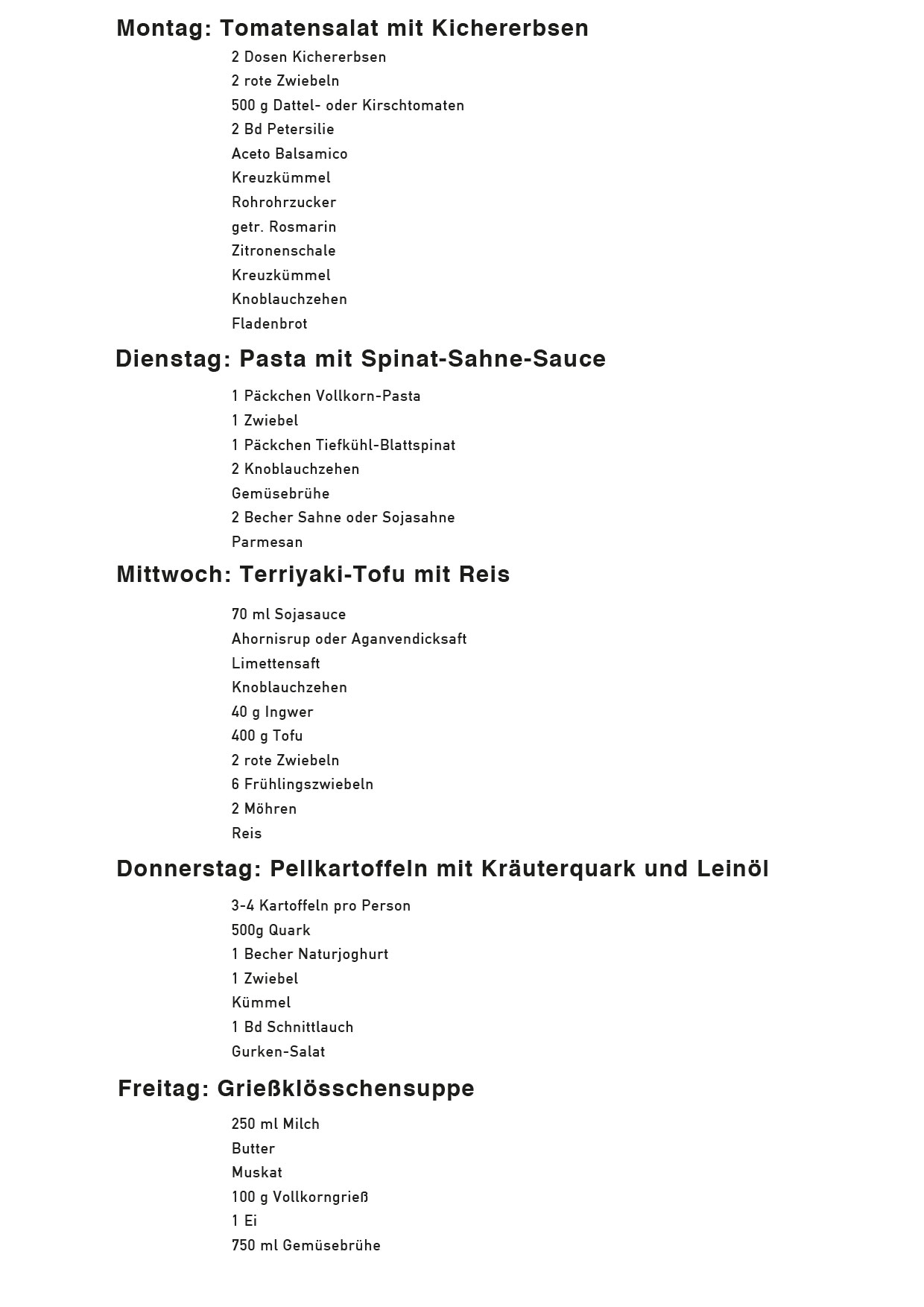 Tomatensalat mit Kichererbsen, Pasta mit Spinat-Sahne-Sauce, Terriyaki-Tofu mit Reis, Pellkartoffeln mit Kräuterquark und Leinöl, Grießklösschensuppe!