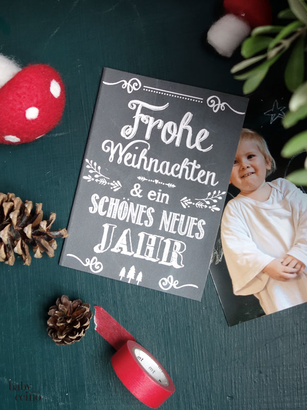 Bei unserer Weihnachtskarte nehmen wir die Idee vom letzten Jahr wieder auf: mit einem Foto von Vincent im weißen T-Shirt vom Papa vor unserer Tafel, ein blonder Weihnachtsengel … (Das Bengel-Wortspiel spare ich mir an dieser Stelle ;))