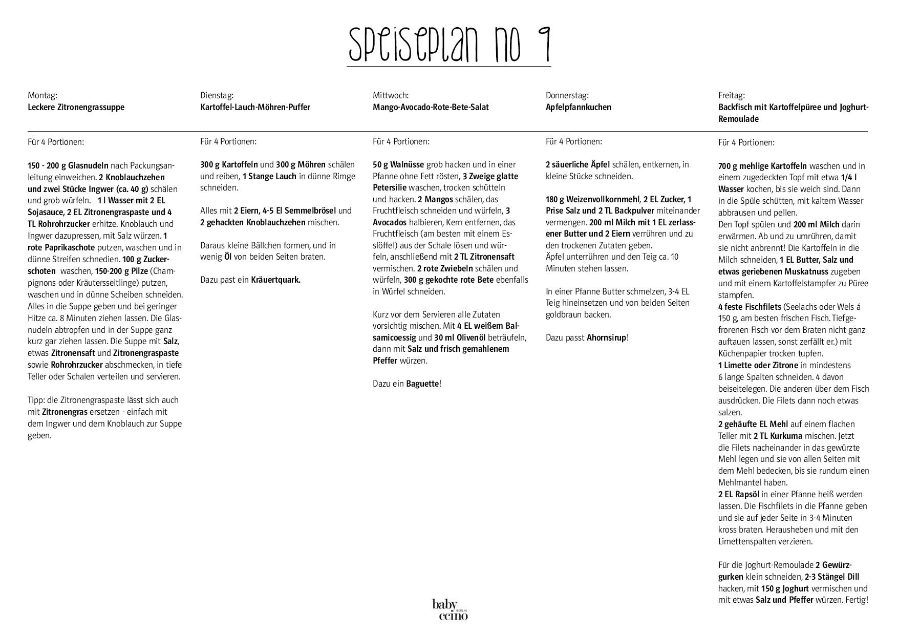 Zitronengrassuppe am Montag (aus: Vegan für Faule von Martin Kintrup), Kartoffel-Lauch-Möhren-Puffer mit Kräuterquark am Dienstag (haben wir bereits auf dem Speiseplan NO 4 vorgestellt), Mango-Avocado-Rote-Bete-Salat am Mittwoch, Apfelpfannkuchen am Donnerstag (aus: Organic Cooking – das Familienkochbuch), und Backfisch mit Kartoffelpüree und Joghurt-Remoulade am Freitag (aus: Das große Wimmelkochbuch)!