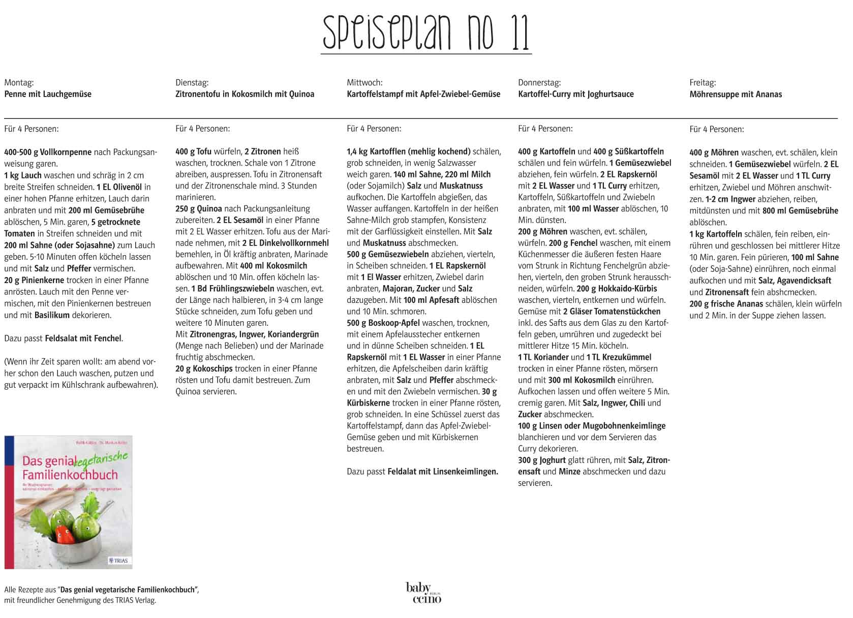Penne mit Lauchgemüse, Zitronentofu in Kokosmilch mit Quinoa, Kartoffel-Curry mit Joghurtsauce, Kartoffelstampf mit Apfel-Zwiebel-Gemüse und Möhrensuppe mit Ananas.