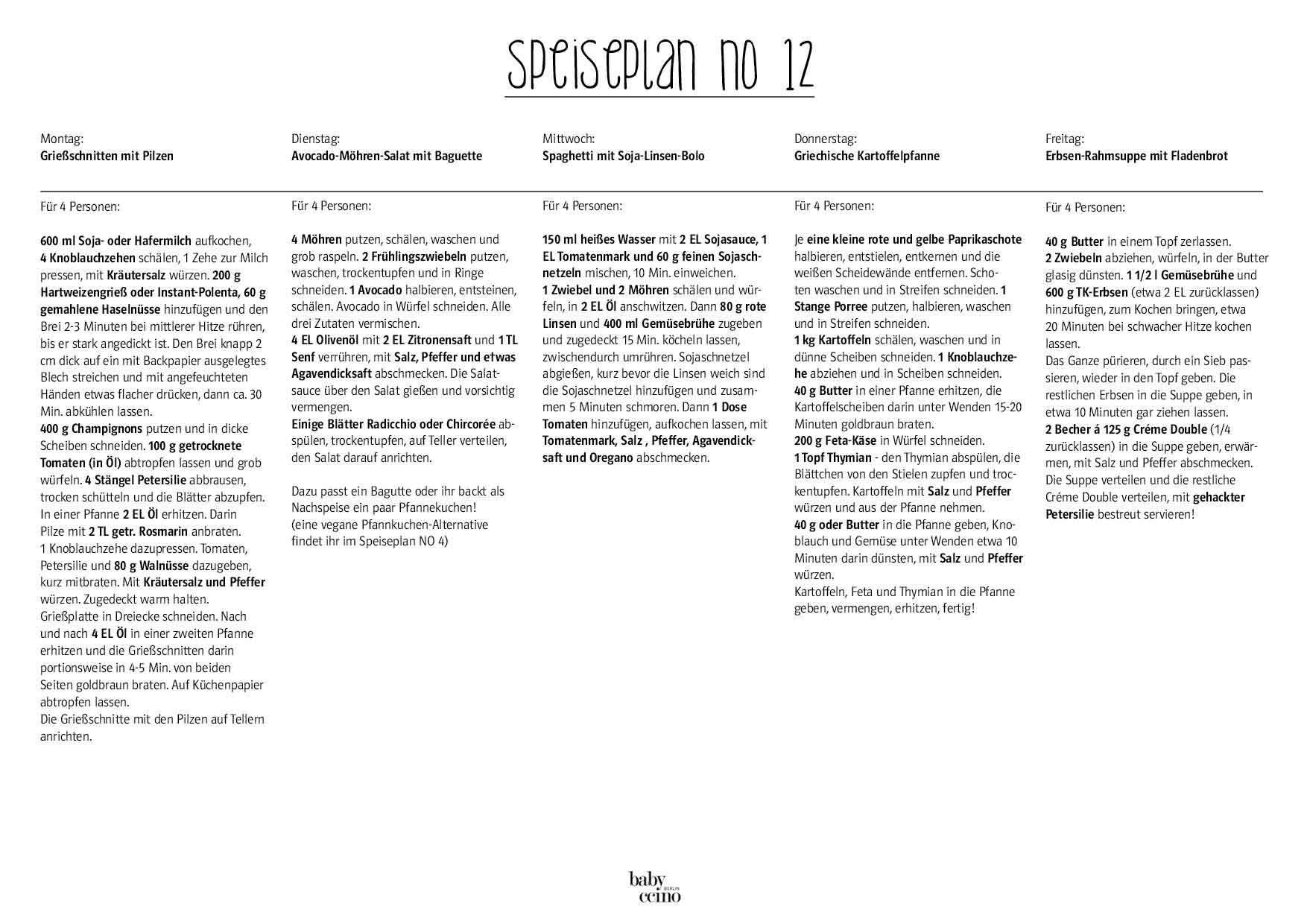 Grießschnitten mit Pilzen, Avocado-Möhren-Salat mit Baguette, Spaghetti mit Soja-Linsen-Bolo, Griechische Kartoffelpfanne und Erbsen-Rahmsuppe mit Fladenbrot.