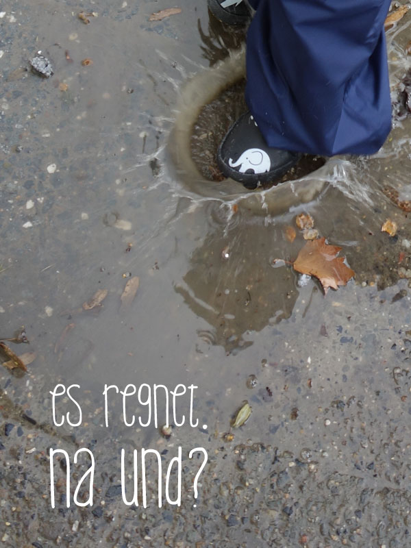 Über die normale Hose, (denn es ist kalt draußen und der Schneeanzug hängt schon gewaschen im Schrank) ziehen wir die Regenhose. Über die Regenhose unsere Wollwalkjacke. Und darüber dann die Regenjacke. Fehlen nur noch die Gummistiefel. Moment, kommen die jetzt über oder unter die Regenhose?! Mütze nicht vergessen!