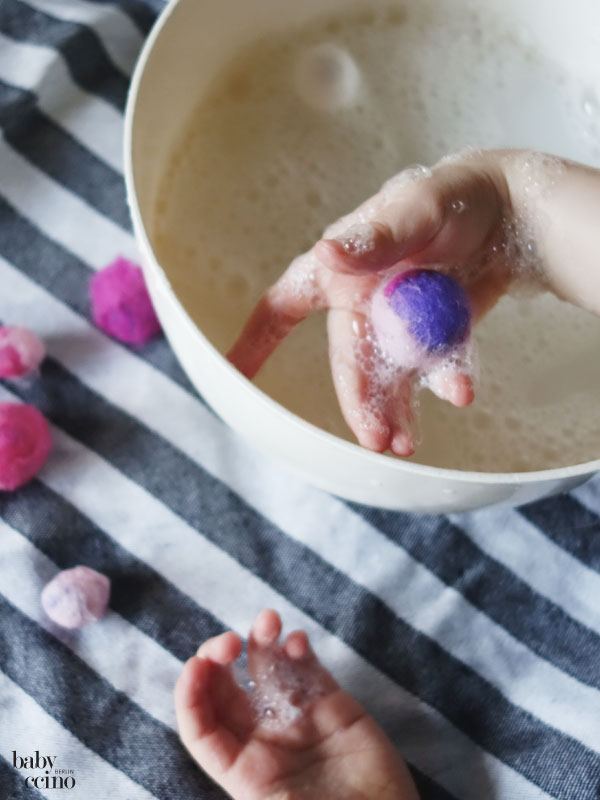 Eine Kurzanleitung zum Filzen findet ihr bestimmt im Netz – wir haben einfach warme Seifenlauge genommen (optional in einer Sprühflasche), die Styroporkugeln mit der ersten Schicht Filzwolle bedeckt, erst leicht angedrückt, eingesprüht (oder eingetaucht), dann fester gedrückt, angefangen in den Händen zu rollen, die nächste Schicht Wolle aufgetragen und so weiter. Man muss ein Gefühl dafür entwickeln. Manche Filzbälle sind super geworden, bei wieder anderen hat sich die Wolle nicht richtig verfilzt. Vincent hatte jedenfalls Spaß mit dem warmen Wasser und der Filzwolle.