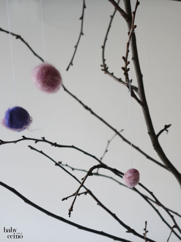 Mit der Nadel und dem Bindfaden einmal durch ein Ende der Filzkugeln ein Stück durchziehen, abschneiden, die Enden verknoten und an einen Zweig hängen.