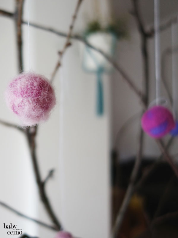Die Filzwolle hatten wir noch von der Einhorn-Party übrig – deshalb wird unser Osterstrauch dieses Jahr rosa, lila und pink!