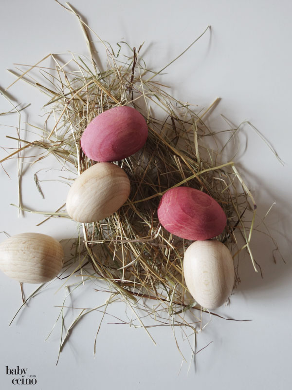 Für unser Osternest haben wir Holzeier aus dem Bastelladen gekauft, zwei davon hab ich mit Rote-Bete-Saft gefärbt. Nach dem Osterfest kann Vincent die Eier dann noch prima in seiner Spielküche bzw. im Kaufmannsladen nutzen!