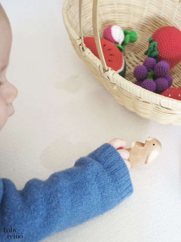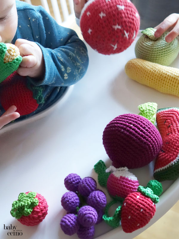 Ein Set gehäkeltes Obst und Gemüse (das im übrigen ganz hervorragend zu Oma’s Fliegenpilz passt), hat der Osterhase für die Jungs versteckt. Und beide spielen sehr begeistert damit! Der eine rasselt und nuckelt, der andere feilscht und verkauft!