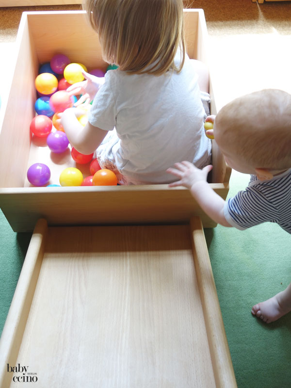Für das Bällebad haben wir seinen Rollkasten ausgeräumt (ging am schnellsten), und ihn mit den Bällen gefüllt.
