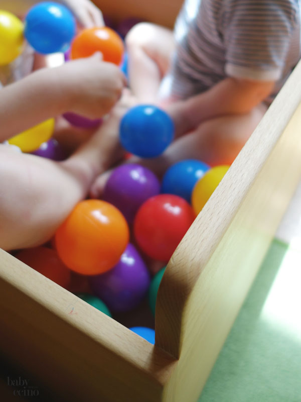 Unsere Nachbarn haben ein kleines Planschbecken gefüllt mit vielen bunten Plastikbällen, ein Bällebad also. Da stehen die Kinder total drauf! Wir haben uns die Bälle für das Wochenende ausleihen dürfen, und unser eigenes Bällebad gemacht.