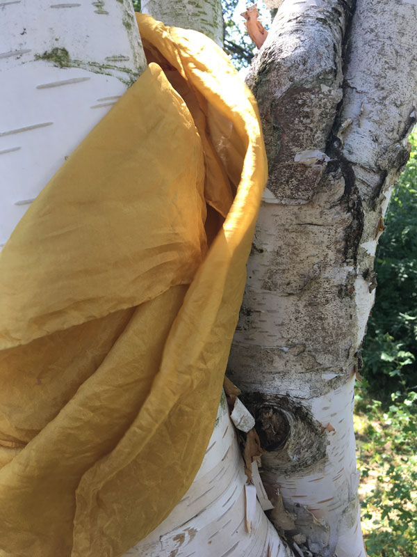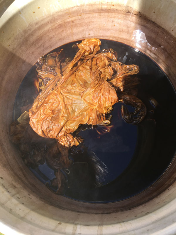 Nachdem ihr die Rinde in einen alten Stoffbeutel gegeben habt, kocht ihr den Sud zwei Stunden lang und belasst das Säckchen noch eine Nacht darin, anschließend das Säckchen mit dem Färbegut entfernen.