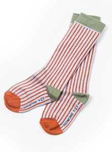 Gestreifte Kniestrümpfe in Kupfer und Mint aus Bio-Baumwolle (+Polyamid & Elasthan). Zum Beispiel über kleineskarussell.de