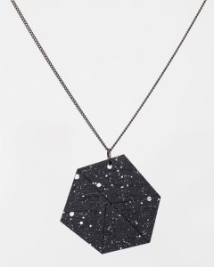 Geometrischer Anhänger aus dünnem Birkenholz, der an einer feinen platinfarbenen Kette hängt.