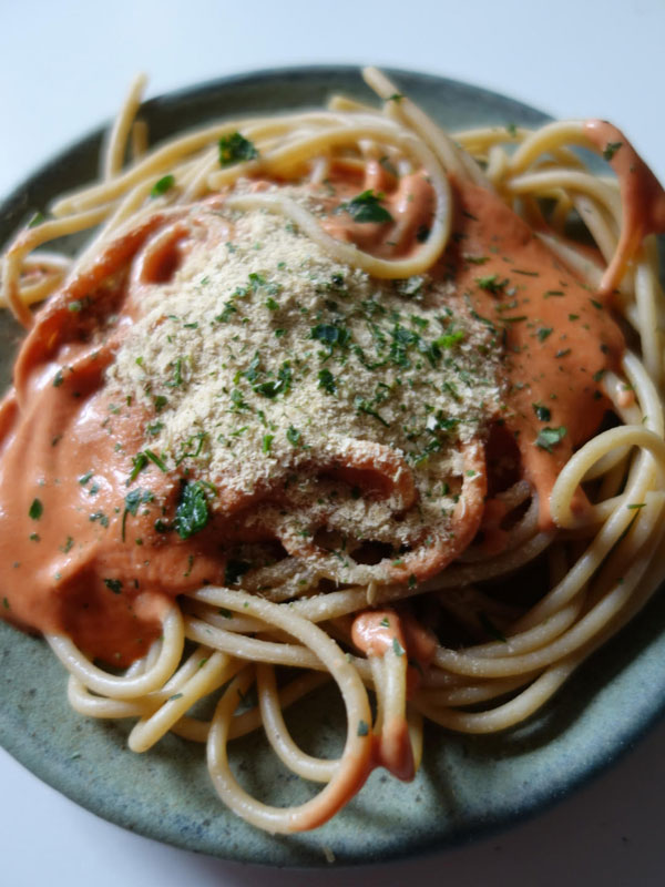 Pasta nach Anleitung kochen. Für die Soße ein bis zwei Becher Sahne in einen Topf geben, etwas Brühe unterrühren, warm werden lassen, und soviel Tomatenmark unterrühren, dass die Soße ein richtig schönes rot bekommt. Nach Belieben frische Kräuter aus dem Garten oder aus der Tiefkühltruhe dazugeben. Ganz oft gebe ich auch noch einen Esslöffel Hefeflocken (reich an Mineralstoffen und Vitaminen wie B1, B2, B5, B6, Folsäure …) dazu, am besten kurz vor dem Servieren unterrühren und nicht mehr kochen lassen. Jetzt noch ein bisschen Parmesan und Rohkost dazu, fertig.