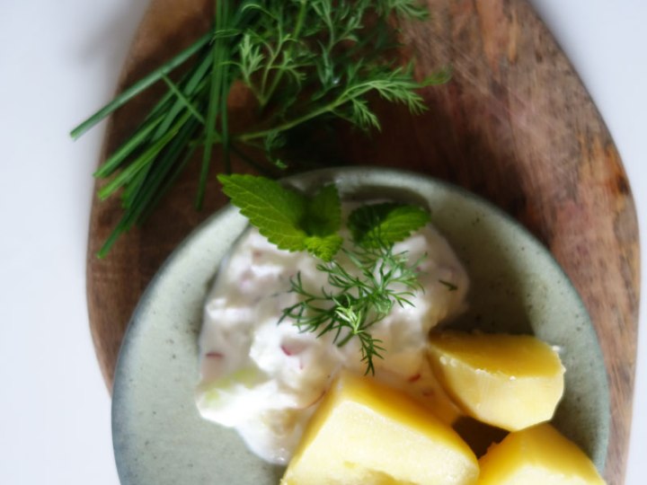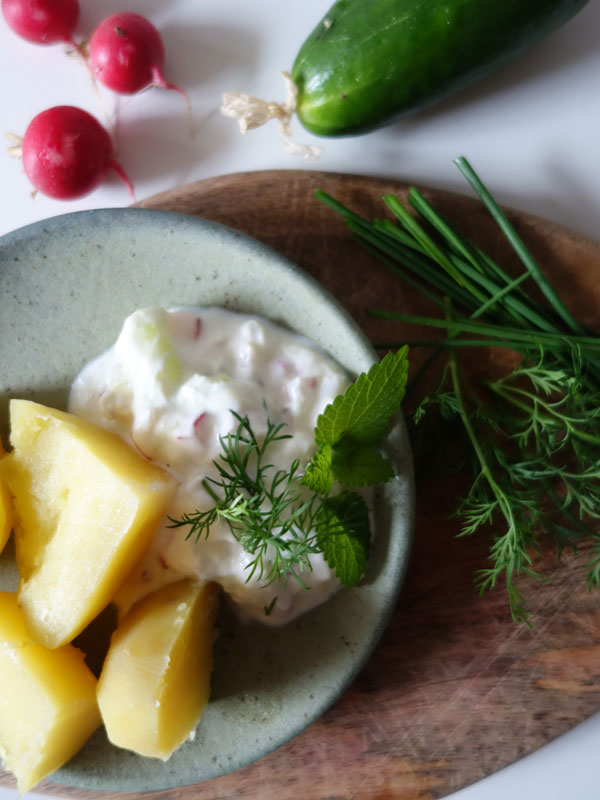 Einen ähnlichen Dip kann man auch zum Ofengemüse machen. Während das Gemüse schön heiß im Ofen vor sich hin schmort (wir nehmen zum Beispiel Süßkartoffeln, Kartoffeln, Rote Bete, Pastinake, Aubergine und Paprika), einfach die gewünschte Menge Joghurt in eine Schüssel geben, ein Stück Gurke fein raspeln und unterrühren, mit Kräuter, Salz und wer mag Minze oder Koreander abschmecken.