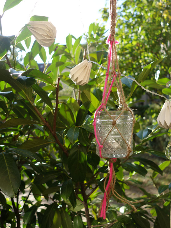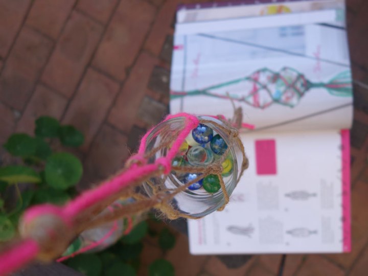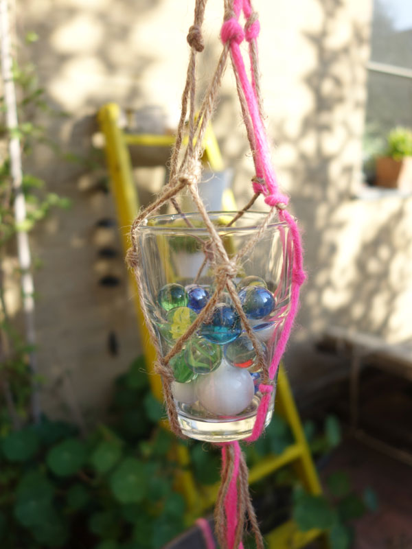 Wenn dein Netz lang genug ist, fasst du die Stränge unten zusammen und verknotest oder umwickelst sie. Zum Schluss fädelst du vorsichtig das Glas in das Netz. Hält alles? Dann kannst du die Mini-Makramee-Ampel aufhängen.