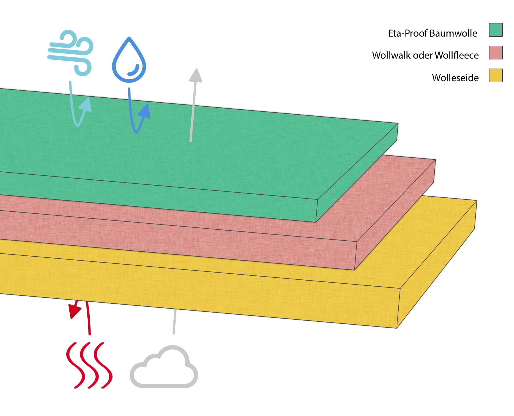 EtaProof ist regenfest, absolut winddicht und mit einer Atmungsaktivität ausgestattet, die nur mit Naturmaterialien erreicht werden kann – und die wir schon vom AngelCab kennen …