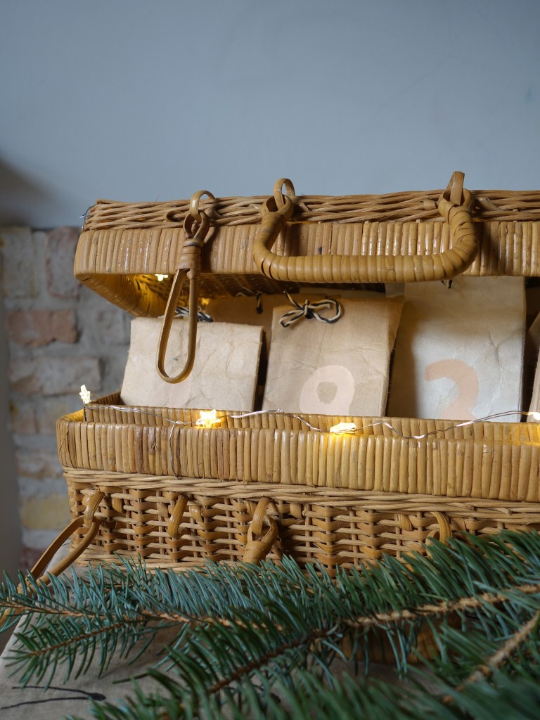 Zwei wunderhübsche Rattankoffer, die ich Stephanie von @derachteundderneuntezerg über Instagram abgekauft habe, wurden mit den kleinen Adventsüberraschungen gefüllt. Dazu eine Mini-Lichterkette, die es momentan tatsächlich überall für wenig Geld zu kaufen gibt, fertig.