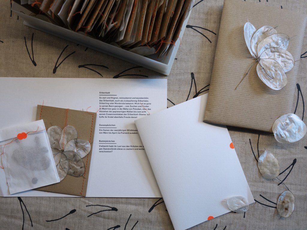 Die Samen des Silberblatt (oder Mondviole, Lunaria, Judaspfennig …) in kleine Samenpäckchen verpackt, die filigranen „Blätter“ zu einem Stern zum Aufhängen verbastelt, und weitere als Bastelpäckchen zum Verschenken beigelegt … und das ganze 24 Mal 😉